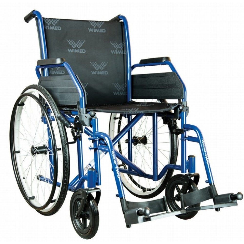 Carrozzina standard ad autospinta con telaio stabilizzante in acciaio verniciato, pedane estraibili, sedile e schienale in tela di Nylon nera.